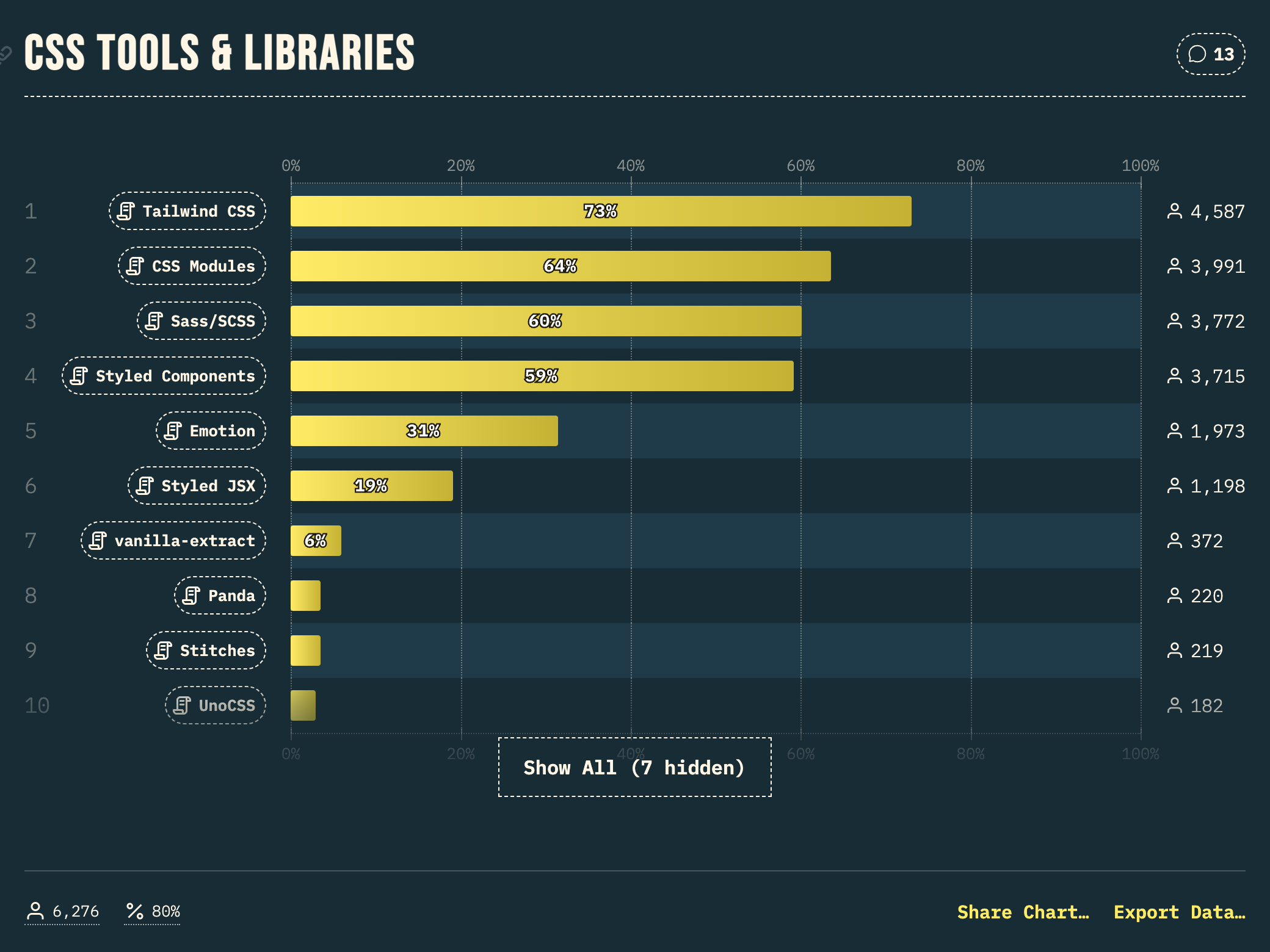 Did Tailwind kill CSS-in-JS? Or did CSS itself simply catch up? In any case the days of getting fancy with CSS architecture seem to be over, as the top three spots are all taken by longstanding CSS tools.