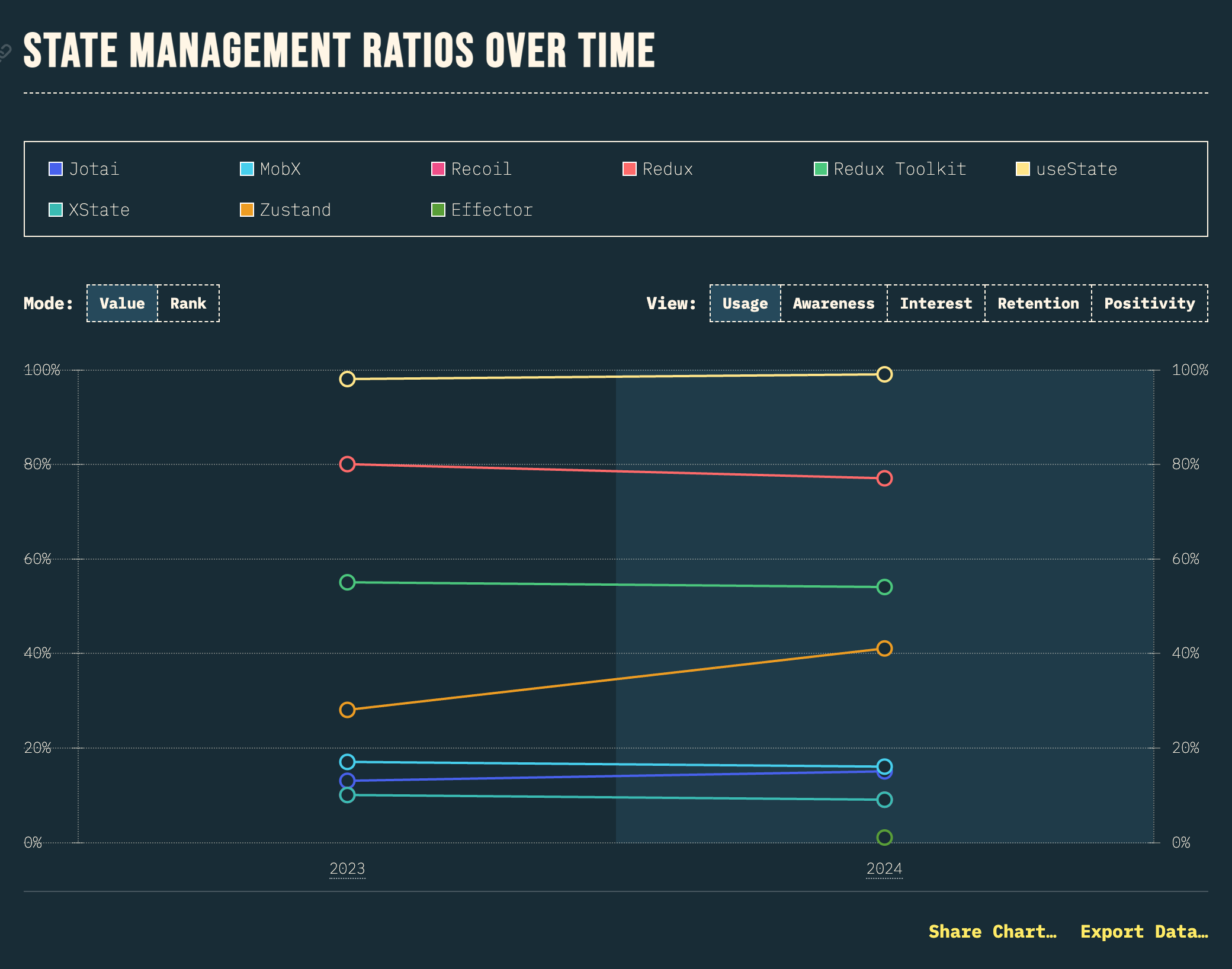 (訳) Zustandは好感度においてその優位性を確固たるものにしており、デフォルトのuseStateのみがこれよりも高いスコアを出しています。また、使用率においても成長しており、この1年で28%から41%に増加しています!